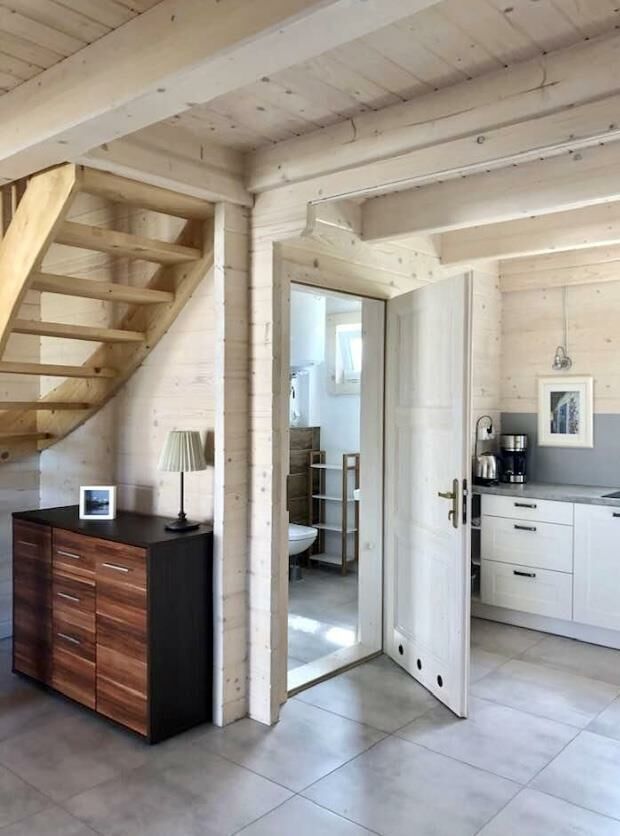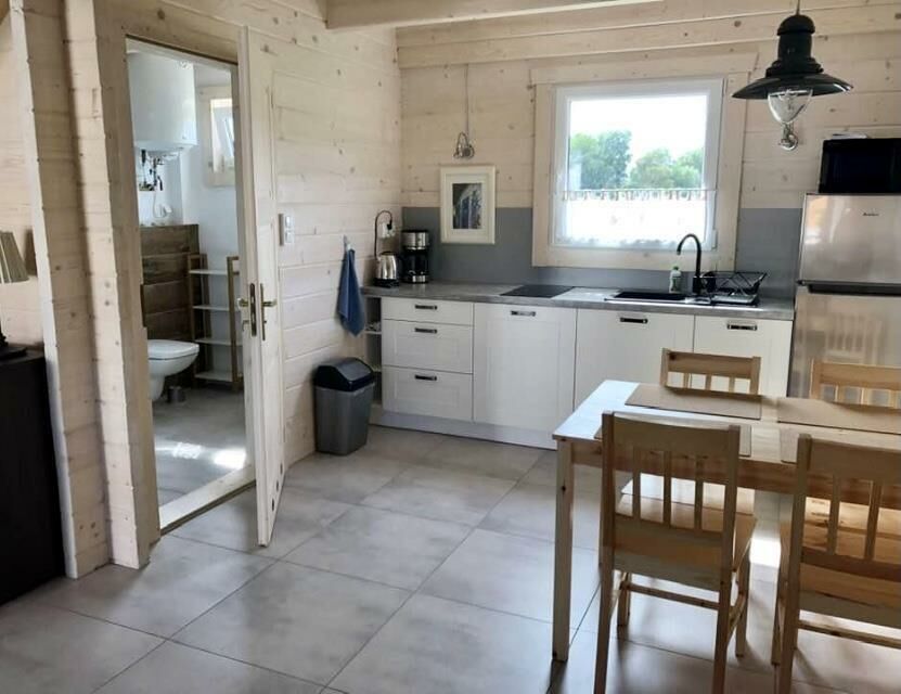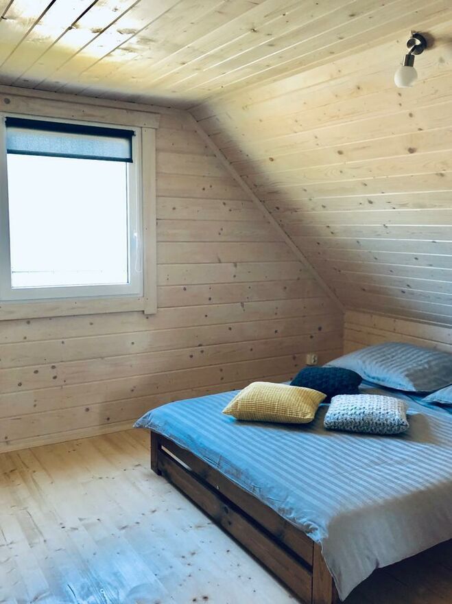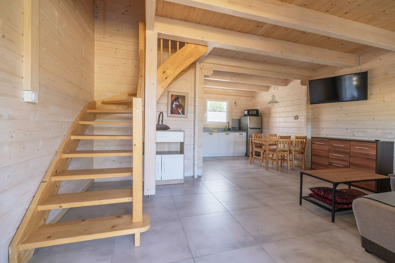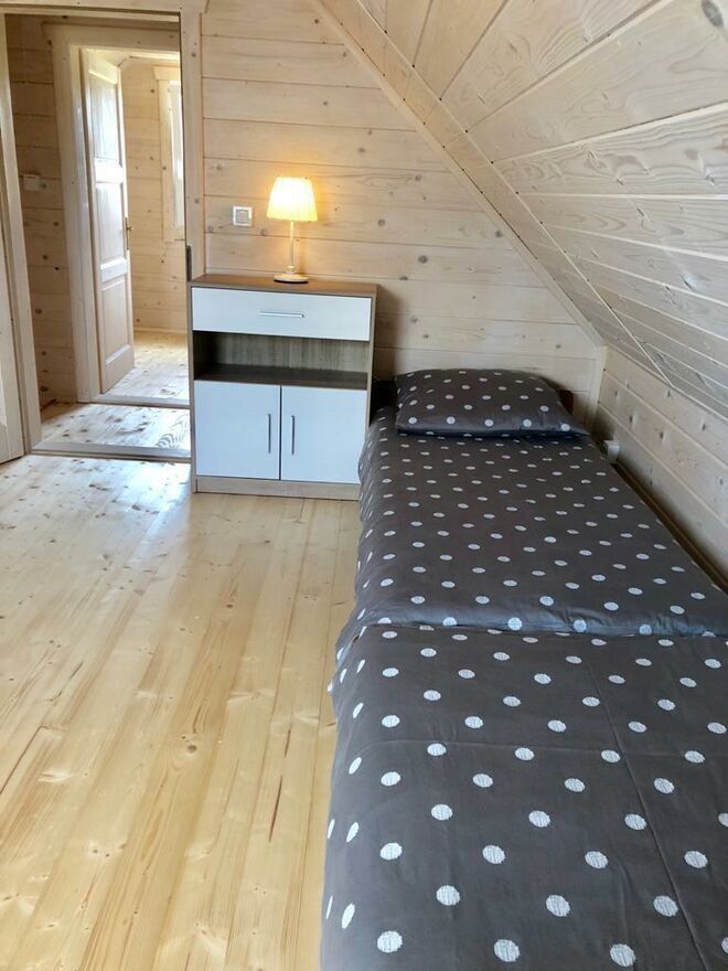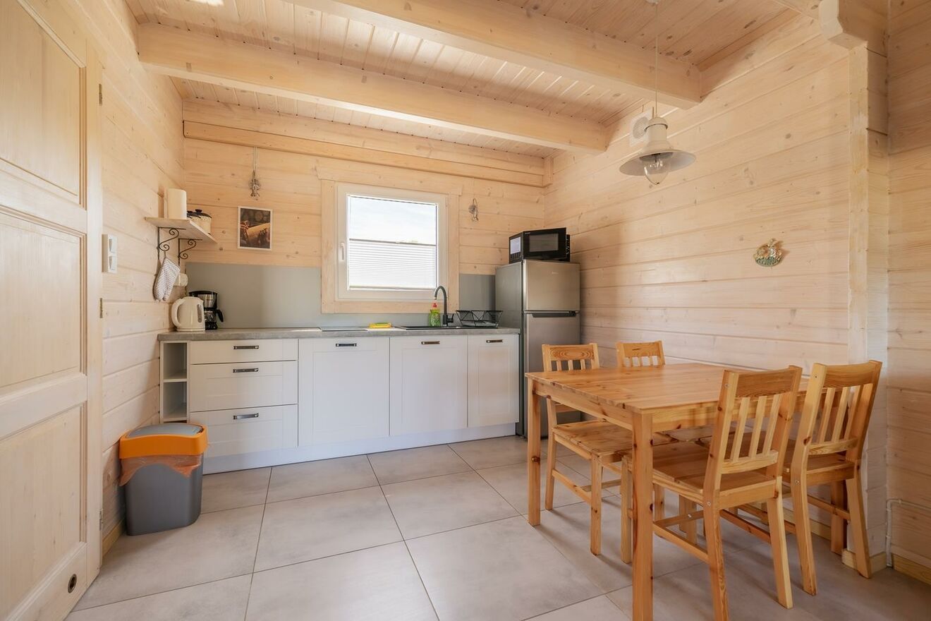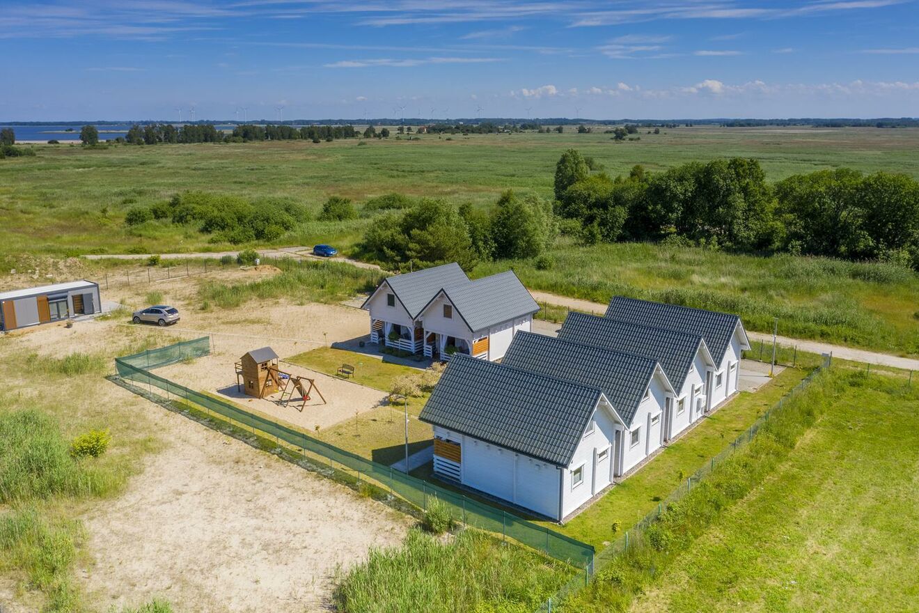 Domki są bardzo komfortowe a wyposażenie dostosowane jest między innymi do rodzin z małymi dziećmi (łóżeczko dla dziecka, krzesełko do karmienia, a nawet wanienka). Na parterze przestronny salon z aneksem kuchennym i na piętrze dwie wygodne sypialnie. Na terenie plac zabaw dla dzieci,